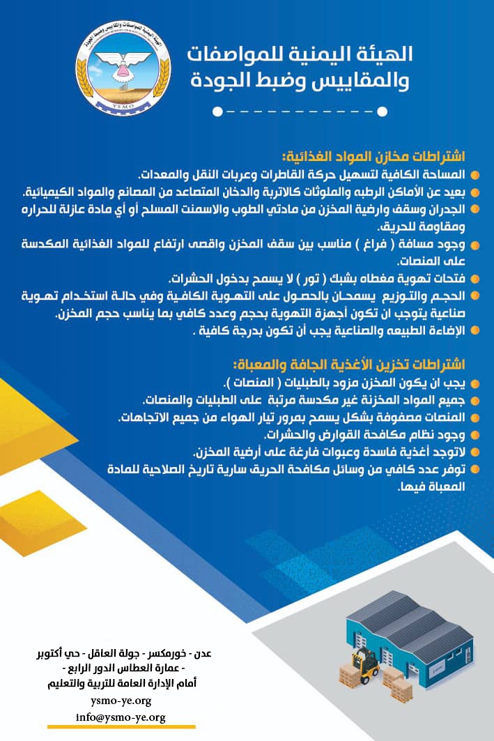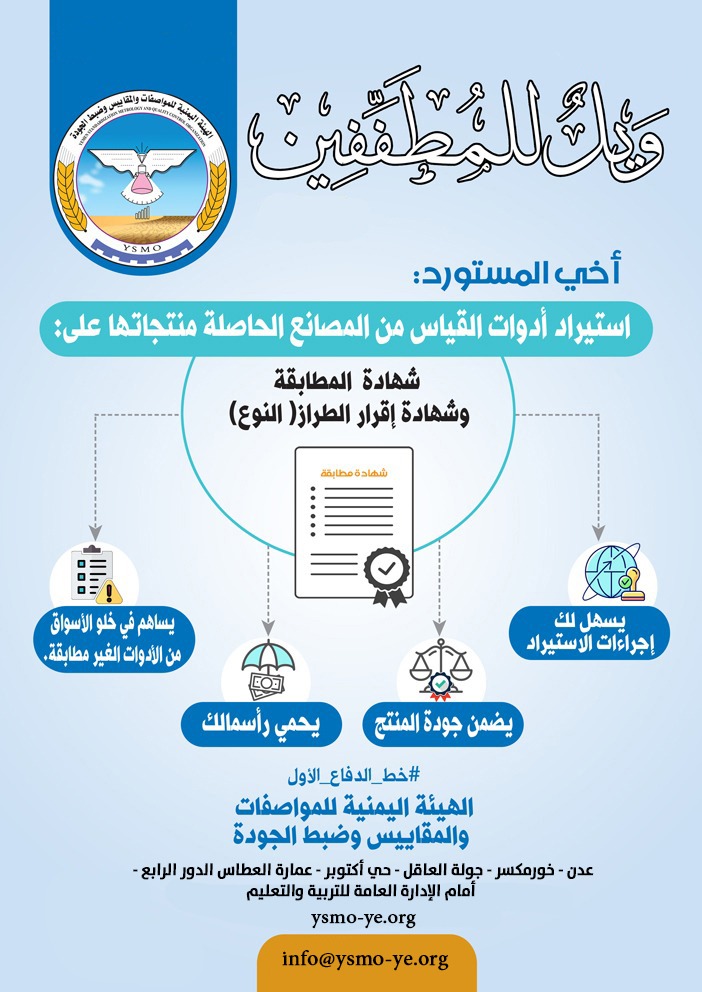 أخي المصنع: التزامك بتطبيق المواصفات القياسية اليمنية له أثر بالغ الأهمية في رفع مستوى جودة الإنتاج والحفاظ على صحة وسلامة المواطن وحماية البيئة.