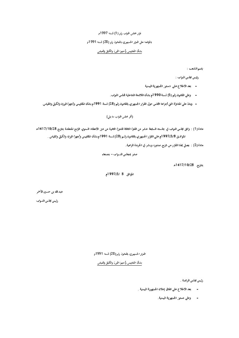 قرار مجلس النواب رقم (1) لسنة 1997م بالموافقة على القرار الجمهوري بالقانون رقم (28) لسنة 1991م
