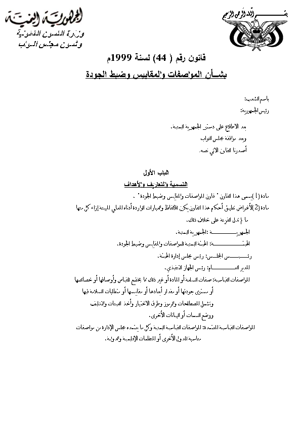 قانون رقم (44) لسنة 1999م بشأن المواصفات والمقاييس وضبط الجودة