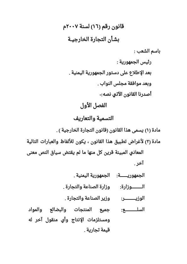 قانون رقم (16) لسنة 2007م بشان التجارة الخارجية ولائحتها التنفيذية