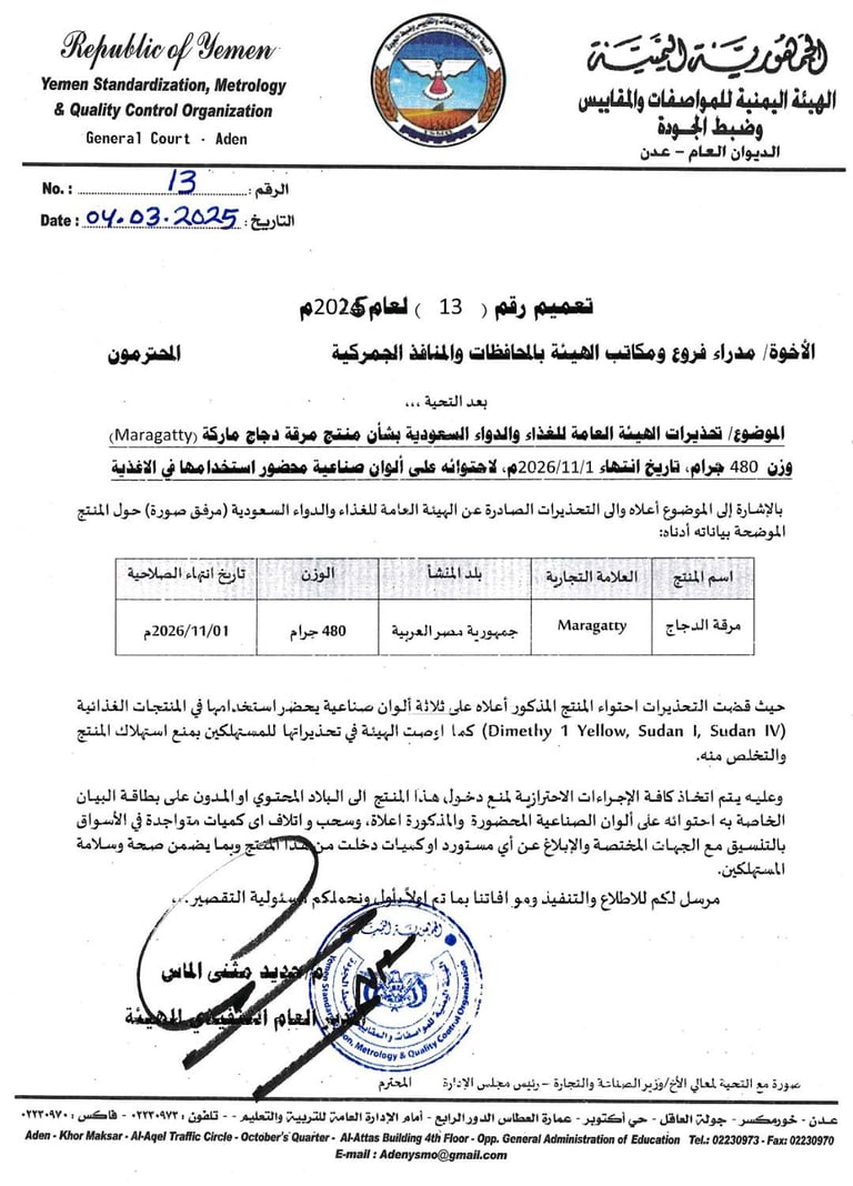 تعميم برقم (13) لعام 2025م بشأن التحذيرات الصادرة عن الهيئة العامة للغذاء والدواء السعودية بخصوص سحب منتج مرقة الدجاج ماركة (Maragatty) ذات منشأ مصري