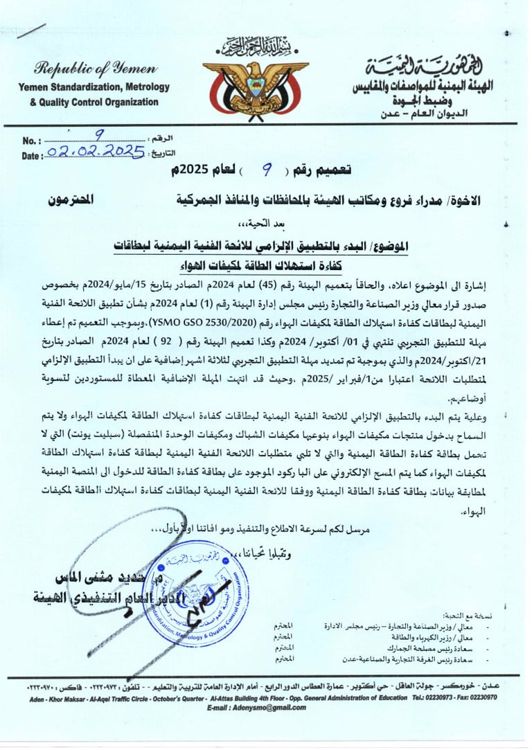 تعميم رقم (9) لعام 2025م بشأن البدء بالتطبيق الإلزامي للائحة الفنية اليمنية لبطاقات كفاءة استهلاك الطاقة لمكيفات الهواء