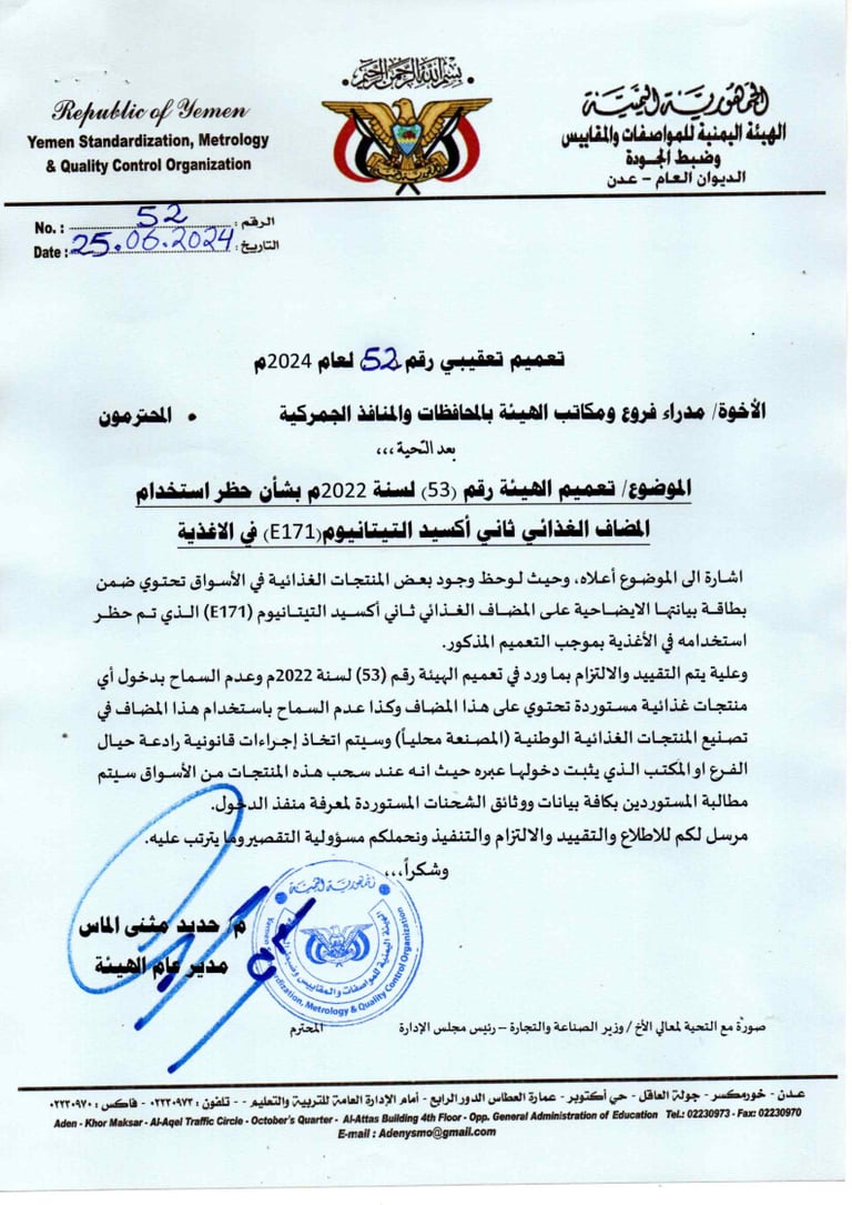 تعميم رقم (52) لعام 2025م بشأن حظر استخدام المضاف الغذائي ثاني أكسيد التيتانيوم (E171) في الأغذية