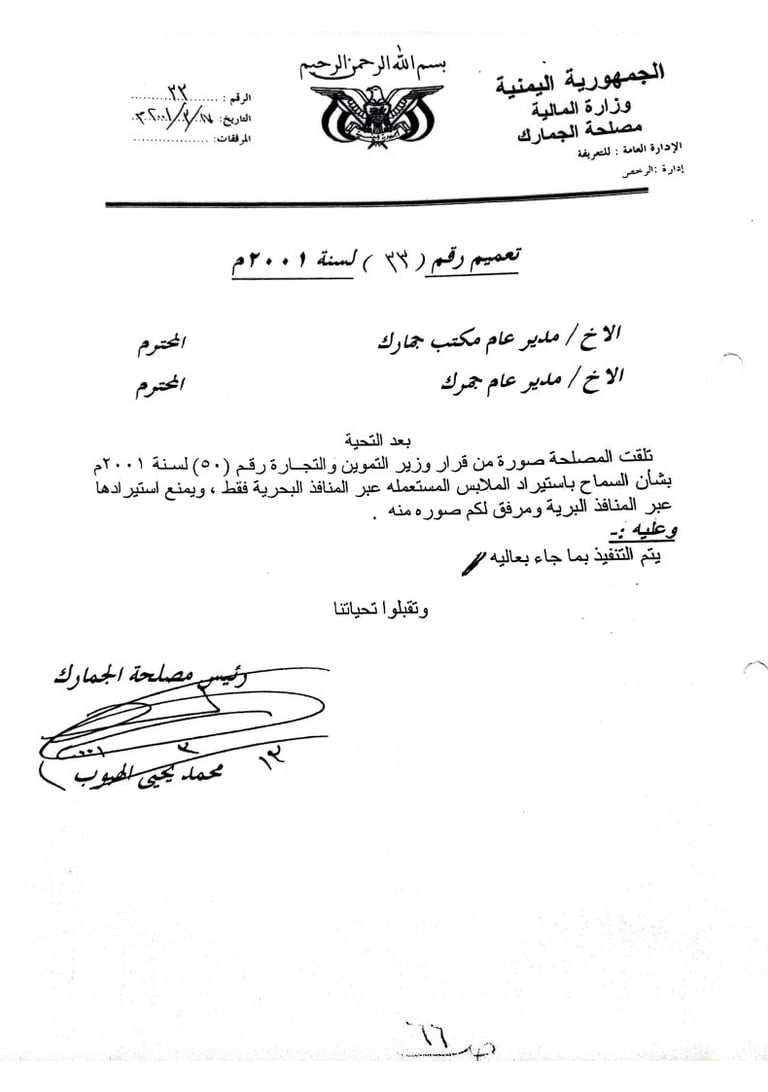 تعميم رقم(33) لسنة 2001م لمنع استيراد الثياب المستخدمة عبر البر